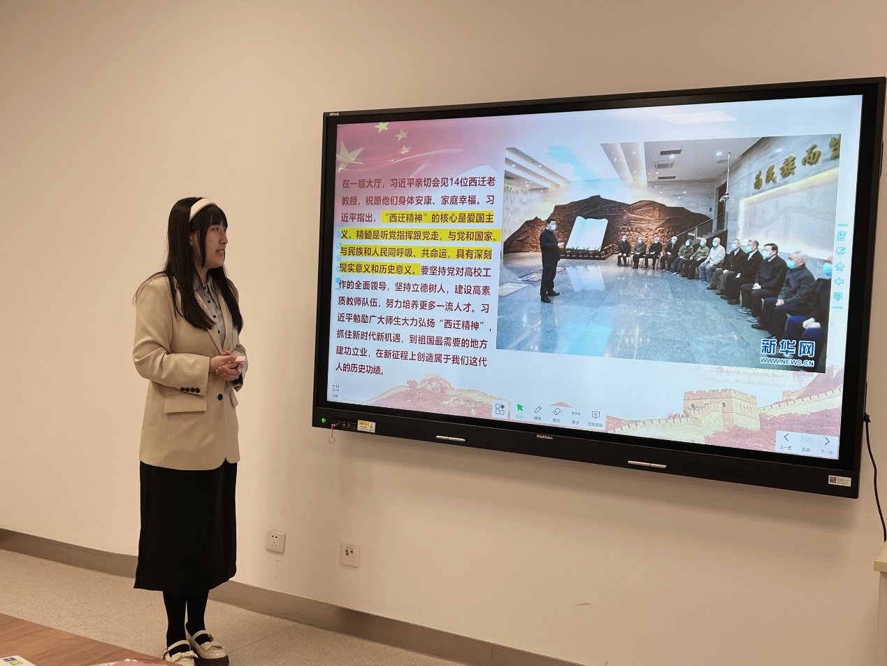 随后,支部成员共同观看西迁老教授口述访谈微视频,从西迁老教授的视角追溯回忆西迁往事,了解西迁前辈的求学生活、工作经历、西迁创业等方面的故事,聆听西迁前辈的亲切话语,重温那一段激情燃烧的岁月。观看视频过后,支部书记于欣欣分享了拜访西迁老教授卢志林的经历。卢志林老师已88岁高龄,1956年参加工作,1956年7月随原交通大学西迁至西安,担任西安交通大学机械工程学院副处级干部,主要负责学校学院人事管理和党建宣传等相关工作,1996年9月离休。在与卢老的交流中,他从当年毅然踏上前往西安的火车回忆起,谈起当年西北的风沙恶劣天气和第一届招生的不易;又讲到了上世纪八九十年代参与筹建机械制造系统工程国家重点实验室(原精密微纳制造技术全国重点实验室)的时候大家从无到有所作出的努力。忆往昔,卢老先生满满自豪;展望未来,卢老嘱托我们再接再厉,传承弘扬西迁精神,为新时代做出新贡献。