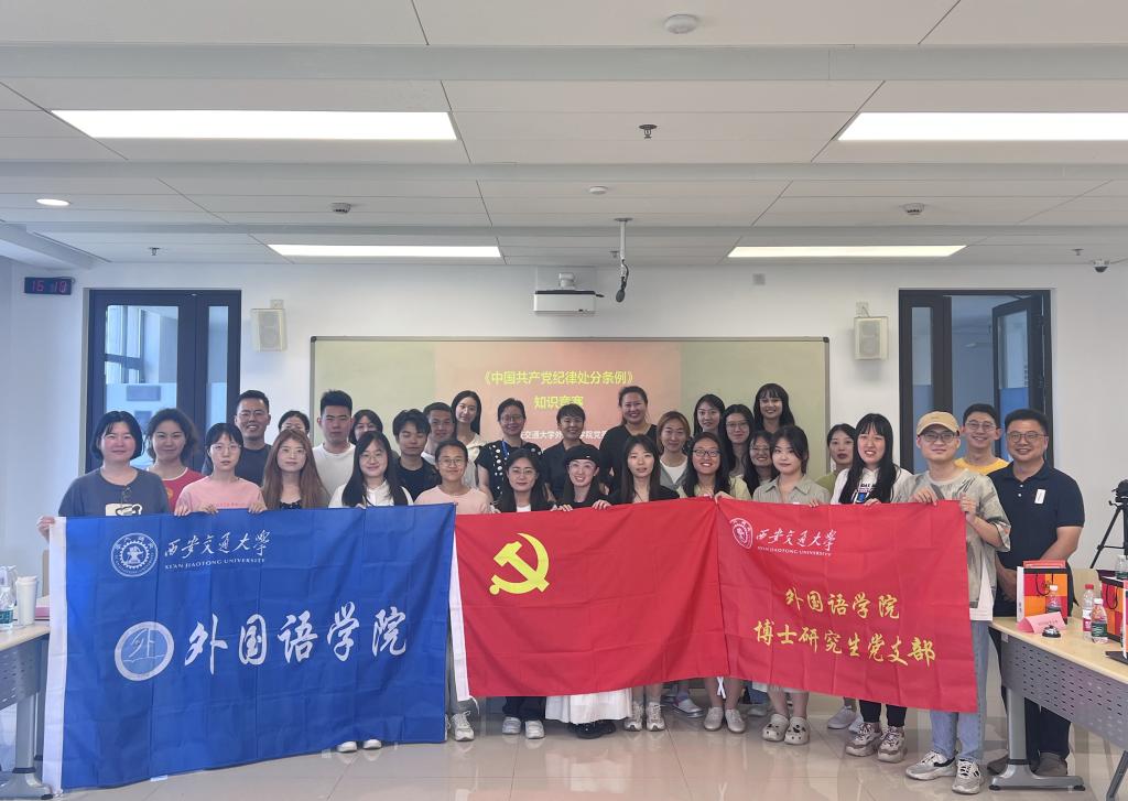 为扎实开展党纪学习教育,提高广大学生党员的纪律意识,5月22日下午,外国语学院在创新港涵英楼5-6108教室成功举办《中国共产党纪律处分条例》知识竞赛。活动由博士生党团支部承办,博士生团支部书记祝尚珍主持,外国语学院院长陈向京老师、党委副书记许明老师、团委副书记薛璇玑老师出席,外国语学院各研究生党支部组队参加。