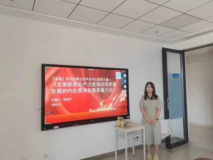 党员张佳玉同志介绍了习近平总书记在《求是》杂志上发表的重要文章《发展新质生产力是推动高质量发展的内在要求和重要着力点》。文章强调,新时代以来,党中央作出一系列重大决策部署,推动高质量发展成为全党全社会的共识和自觉行动。张佳玉还介绍了西安交通大学为发展新质生产力所提出的举措以及做出的努力。党员赵晶则介绍了我国的就业相关政策,强调了党和政府对就业工作的重视,以及国家在完善重点群体就业支持方面所做的努力。