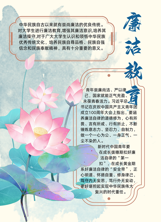 为进一步加强党员的党性教育,提高党员同志们的责任意识和廉洁自律意识,让“清廉之花”绽放在大学生党员心田,特召开此次“永葆廉洁心”主题党课。为了弘扬廉洁文化,我们设计了“清风廉洁文化教育”系列海报,整个作品以“莲”象征“廉”,贯穿其中,介绍廉洁文化的悠久历史,推古及今,阐述廉洁文化在现代社会的重要意义,宣传廉洁文化教育,倡导支部全体成员坚定理想信念永葆廉洁初心。