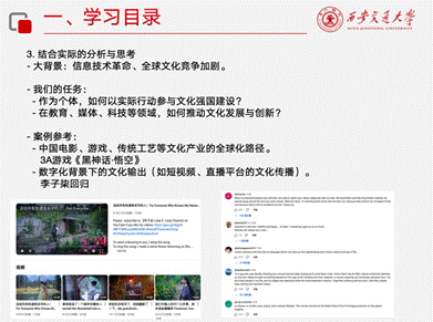 接着,戴诗雨结合中国电影、游戏、传统工艺等文化产业的全球化路径,如3A游戏《黑神话·悟空》,以及数字化背景下的文化输出,如李子柒,提出研究生应用实际行动参与文化强国建设,从每个人做起,坚守文化自信,传承中华文脉,借助新时代的技术和思维,推动文化创新发展。