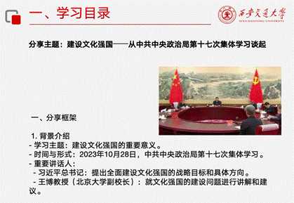 2024年11月21日晚7点,外国语学院硕3123班党支部召开了专题为“贯彻学习二十届中共中央政治局第十七次集体学习重要讲话精神”的组织生活。本次活动旨在深入学习习近平总书记关于文化强国建设的重要讲话,提升党员的思想意识,增强支部成员的责任感和使命感,为推进文化强国建设贡献力量。会议由支部书记王嘉慧主持,支部全体成员及新发展的入党积极分子参加了会议。