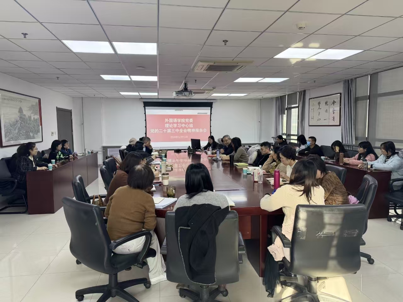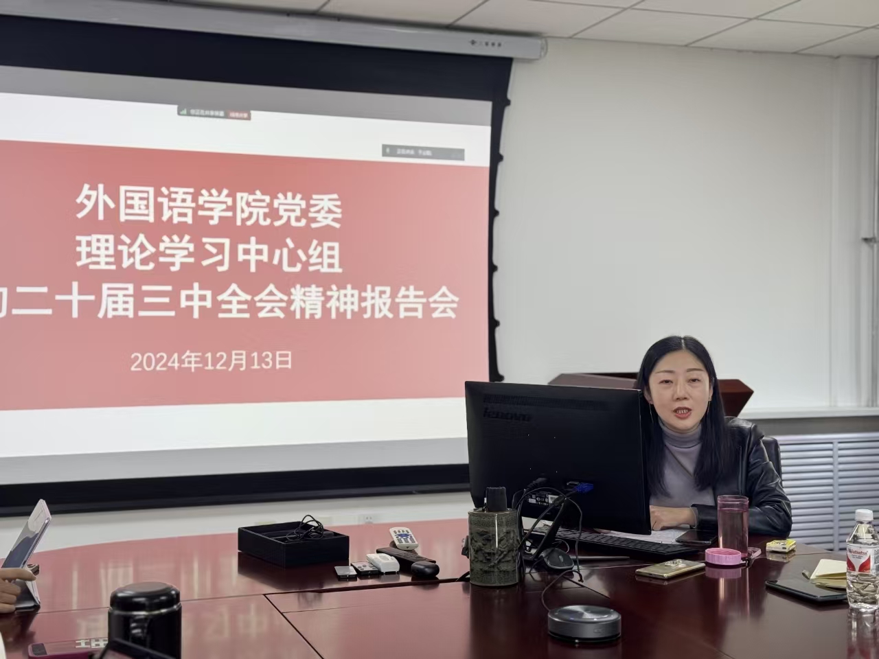 12月13日,外国语学院党委举办党的二十届三中全会精神宣讲报告会,邀请学院钱希教授作《推进教育数智化,助力创新人才培养--外语教育变革中的“新质生产力”》主题报告。学院党政领导干部、党支部书记、系(中心)主任、师生代表参会,学院党委书记张长安主持。