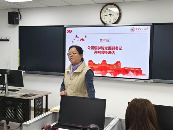 外国语学院党委副书记许明老师对本次组织生活会给予了高度评价,认为会议成功且富有深度,充分体现了党支部的优良传统。许老师指出,学习分享环节中,民营经济座谈和哪吒案例激励了年轻党员突破思维边界,勇于创新,敢于接受时代的挑战。她强调,作为新时代的党员,必须紧密结合国家发展战略,树立远大志向,勇于开辟更广阔的职业发展空间。许老师鼓励外国语专业的学生要更多关注国家政策和行业动向,结合专业发展,提升自己对国家发展战略的理解和应用能力。同时,许老师提出,党支部应进一步丰富活动形式和内容,扩大校内外影响力,并要求党员增强组织纪律性,按时参加各项活动,确保党性修养的持续提升。