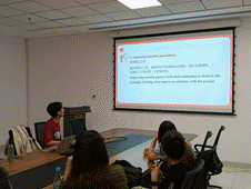 会议第二部分,支部组织委员周一统用英汉双语解读了中央八项规定精神。他首先介绍了中央八项规定精神提出的背景,接着依次讲述了改进调查研究、精简会议活动、精简文件简报、规范出访活动、改进警卫工作、改进新闻报道、严格文稿发表、厉行勤俭节约八方面内容。在讲解过程中,他还将规定精神与专业特色结合,引用官方英文翻译来为支部成员们进行了双语讲解。