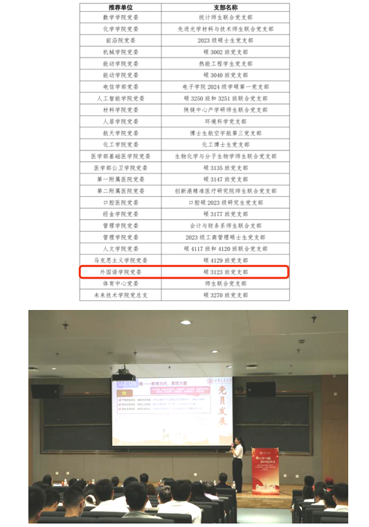 根据《关于举办2025年研究生“十佳党支部”与“特色示范党支部”评选活动的通知》(西交研〔2025〕38号),经过函评与决赛的层层筛选,外国语学院硕3123班党支部从全校84个参赛党支部中脱颖而出,获评“特色示范党支部”。